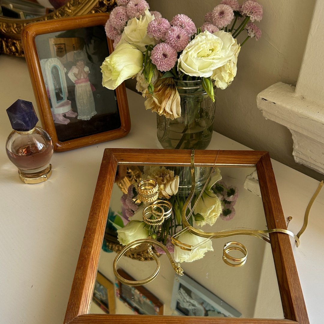 the Catarina ring layered with the twist ring in gold on a model's hand also featuring the Catarina bracelet. A sunny landscape can be seen in the background